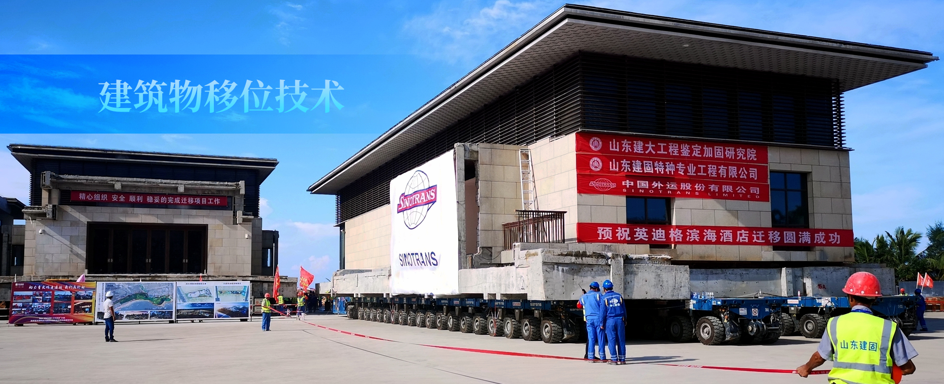 海南紅塘灣酒店為地下1層、地上2層鋼筋混凝土框架結構。占地面積約2400㎡,總建筑面積4658㎡。遷移直線距離約500米,豎向頂升2.3米。紅塘灣酒店遷移工程的成功就位,標志著一個新的記錄誕生:目前國內(nèi)外首例不規(guī)則扇形車輛布置、國內(nèi)拖車移位單體建筑面積最大(4658㎡)、國內(nèi)拖車移位單體建筑重量最重(7500噸)。山東建筑大學工程鑒定加固研究院、山東建固特種專業(yè)工程有限公司成立于1992年,三十年一直秉承“篤志疑難躬行求新”的企業(yè)精神,完成建筑物鑒定與加固改造、建筑移位、建筑糾傾項目六萬余項。山東萊蕪高新區(qū)辦公樓平移項目,建筑面積24000㎡,重量35000噸,是國內(nèi)外最重平移工程;主持完成的